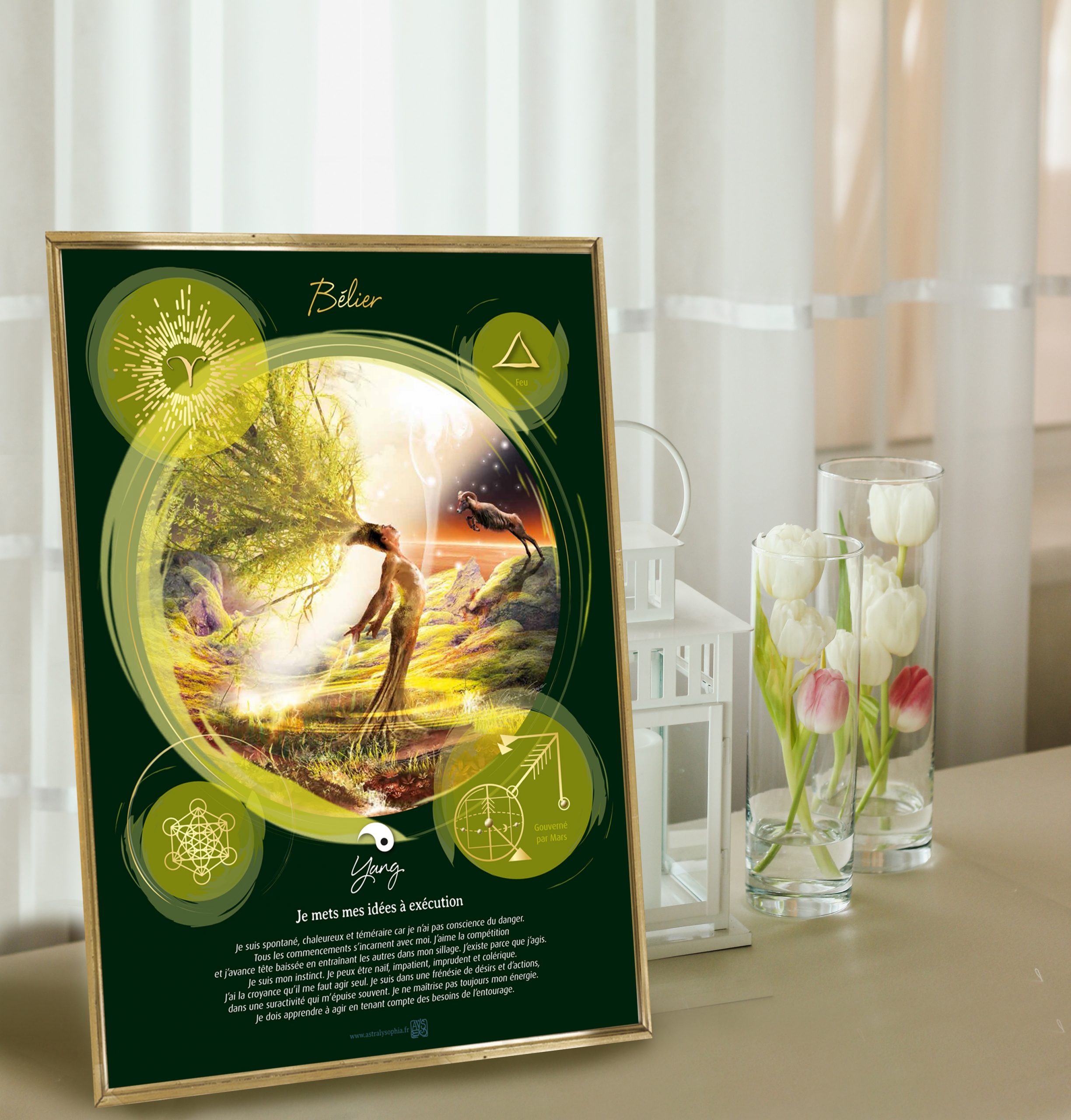 Suite à la création graphique de l’Oracle “Être et Devenir”, je décline les images du zodiaque en affiches au format A3.